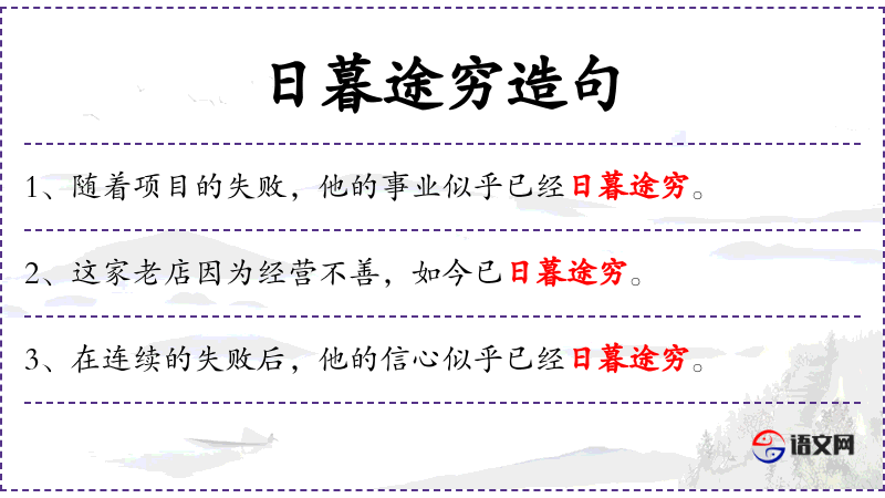 - 日暮途穷:这个成语源自**古代,比喻人的晚年或事物的末路,常用于描述困境或无望的境地。