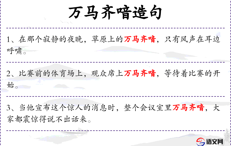 “万马齐喑”这个成语源自古代战场,形容战马在听到号令后立刻安静下来,这里比喻考场内突然变得非常安静。这个成语的使用体现了汉语中常用动物或自然现象来比喻人类行为的传统。