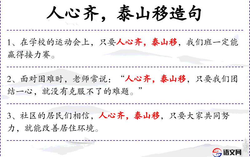 - 泰山移:比喻困难可以被克服,源自成语“人心齐,泰山移”。