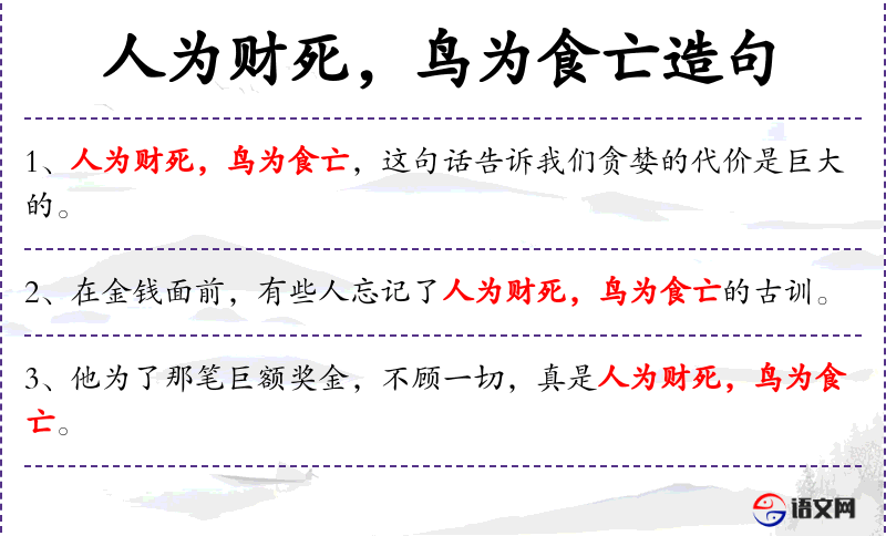 - 人为财死,鸟为食亡:成语,比喻人为了钱财可以不顾生命,鸟为了食物可以不顾危险。