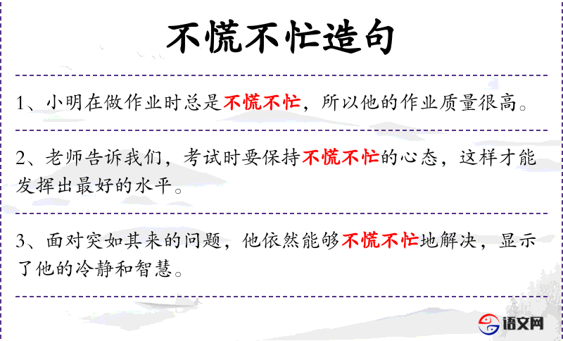1. 【不慌不忙】 不慌张,不忙乱。形容态度镇定,或办事稳重、踏实。