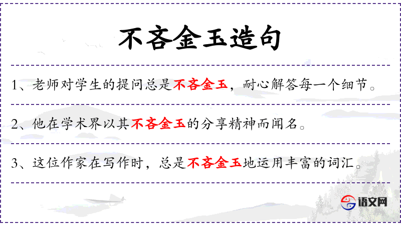 1. 【不吝金玉】 - 吝:吝惜。不吝惜宝贵美好的东西。