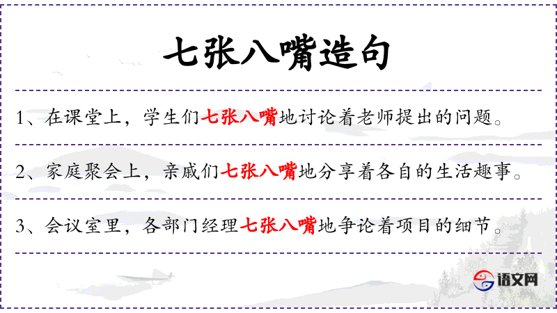 句子中“七张八嘴”是一个汉语成语,形容人多嘴杂,意见纷纭。这个成语反映了汉语中对于集体讨论场景的生动描述。