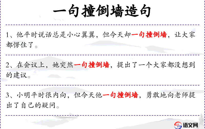 - 一句撞倒墙:这个表达可能源自中文的比喻用法,意味着某人的话非常有力量或出人意料。