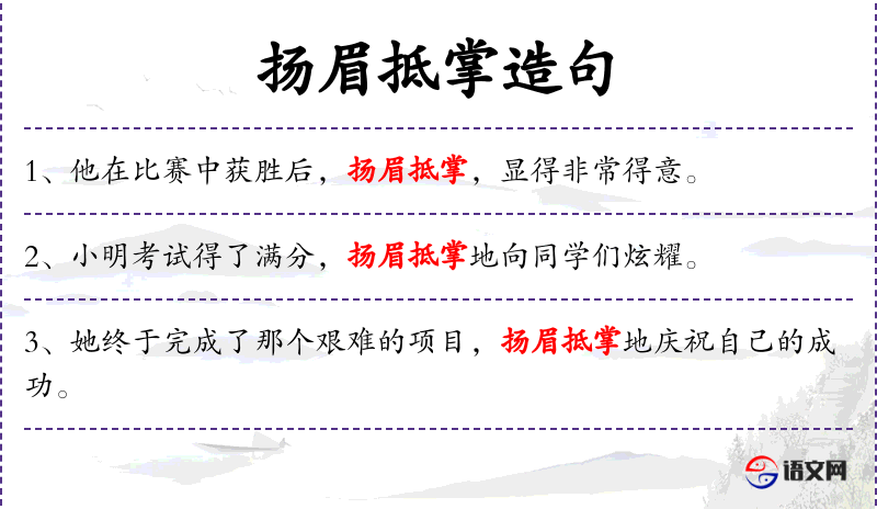 “扬眉抵掌”是一个成语,形容人得意或高兴的样子。这个成语体现了**文化中对表情和肢体语言的重视。