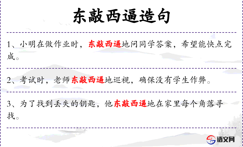 - 成语:“东敲西逼”是一个形容词,用来描述询问时的强硬态度。