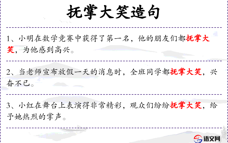 - 在班级演讲比赛中,小丽脱颖而出,赢得了冠军,她的同学们无不为之自豪,纷纷抚掌大笑。