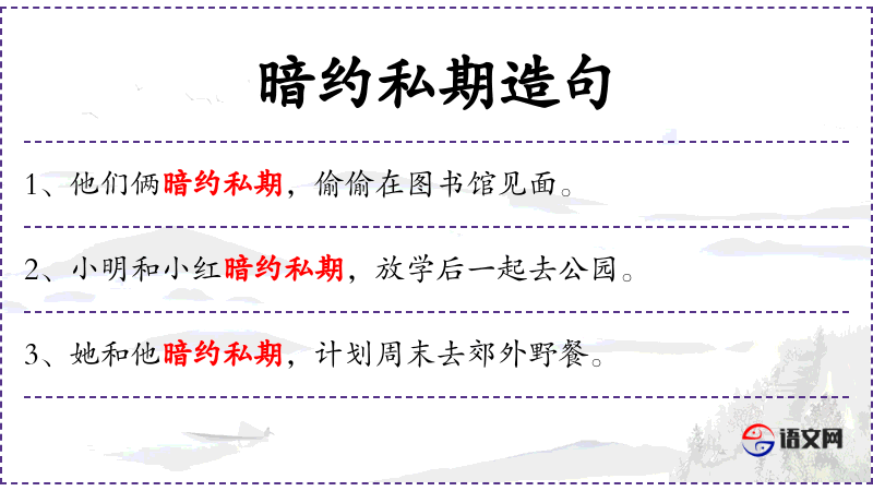 4. 【暗约私期】 约、期:约定。暗地里私自互相定约。旧指青年男女相爱,暗定下婚约。也指男女不正当交往。