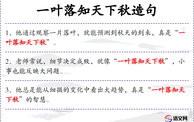 1. 【一叶落知天下秋】 从一片树叶的凋落,知道秋天的到来。比喻通过个别的细微的迹象,可以看到整个形势的发展趋向与结果。