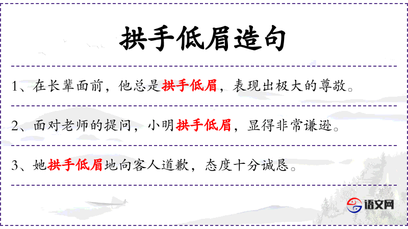 - 拱手低眉:一种表示尊敬或谦卑的身体语言,拱手是双手合十,低眉是低头。