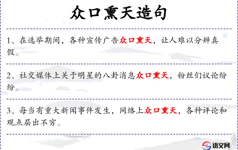 - 谓语:“众口熏天”和“议论纷纷”