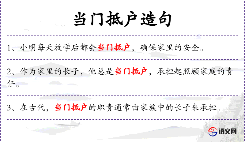 - “当门抵户”这个成语源自**传统文化,意为守门或看家。