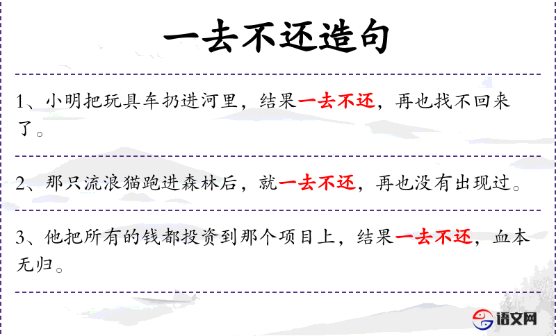 - 相关成语:“一去不复返”是一个相关的成语,用于形容某人或某物离开后不再回来。