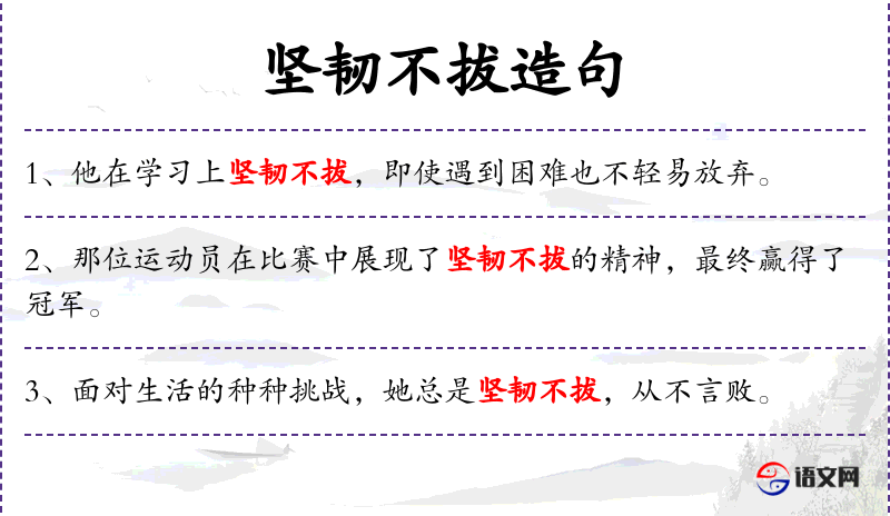 - 坚韧不拔:形容词短语,意为坚定不移,不屈不挠。