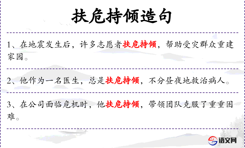 - “扶危持倾”这个成语体现了在困难时刻互相支持的传统美德。