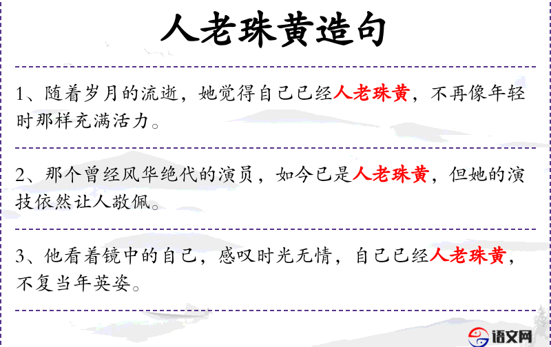 - 人老珠黄:这个成语也源自**文化,用来形容人随着年龄增长而失去青春美貌。