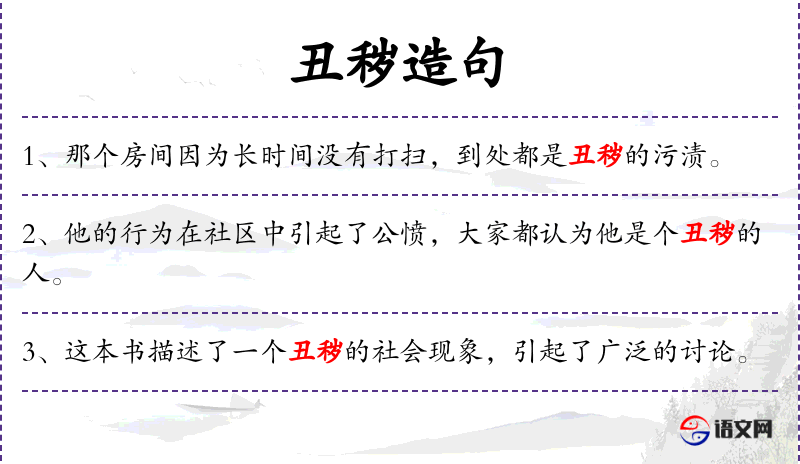1. 【丑秽】 - 丑恶污秽之行;丑恶污秽之事。常指闺门中的丑行; 丑陋肮脏。