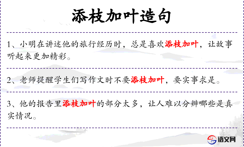 3. 【添枝加叶】 - 在树干上添上些枝叶。比喻叙述事情或转述别人的话,为了夸大,添上原来没有的内容。