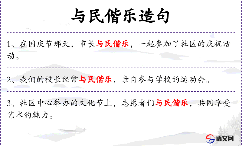 1. 【与民偕乐】 - 原指君王施行仁政,与百姓休戚与共,同享欢乐。后泛指领导与群众一起游乐,共享幸福。