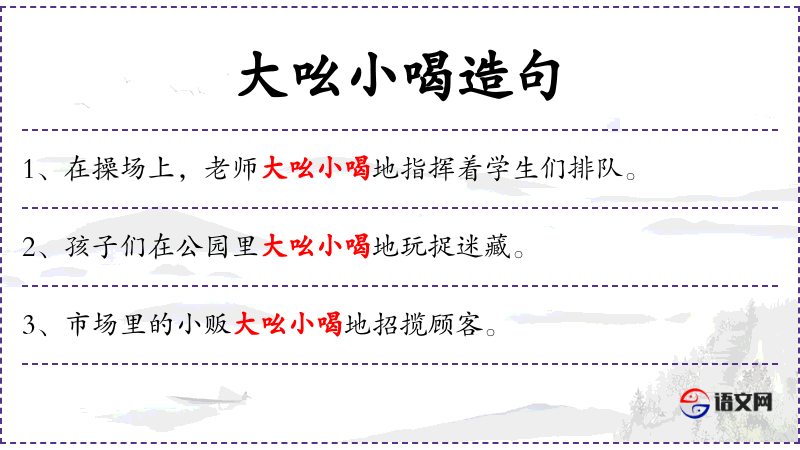 - 状语:比赛现场、大吆小喝地