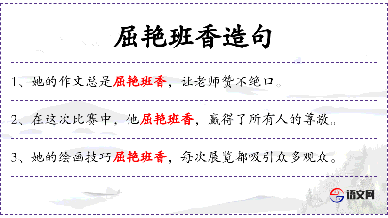 - 文化背景:成语“屈艳班香”在**文化中常用来形容女性的美丽或表演的出色。