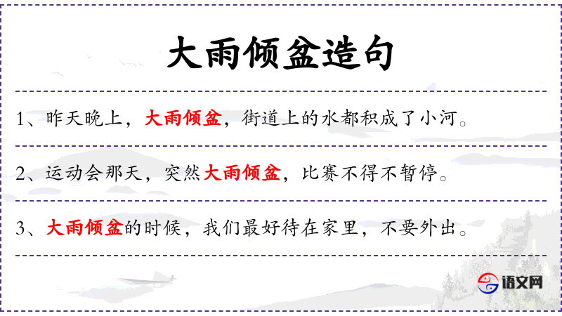 - heavy rain 对应中文的“大雨倾盆”,形容雨下得非常大。
