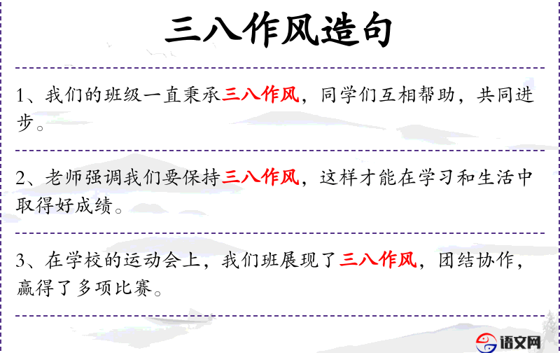 1. 【三八作风】 - 中国人民解放军在长期革命斗争中养成的优良作风。毛泽东同志把它概括为三句话八个字。三句话是坚定正确的政治方向,艰苦朴素的工作作风,灵活机动的战略战术;八个字是团结,紧张,严肃,活泼。通称三八作风。