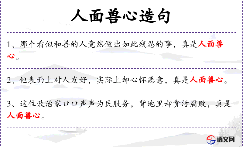 - 人面兽心:这个成语源自**古代,用来形容外表和内心不一致的人。