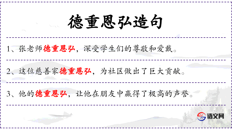 - 德重恩弘:这个词组意味着某人品德高尚,恩惠广泛。