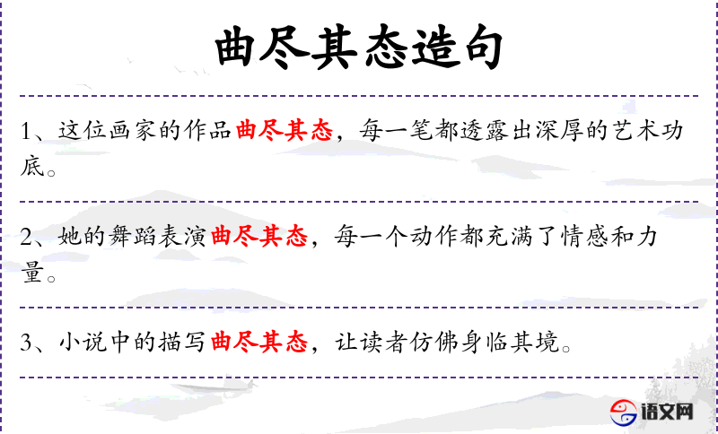 3. 【曲尽其态】 - 曲:委婉细致。曲折委婉地充分表达其姿态。形容表达技巧非常高明。