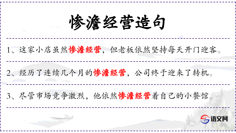- 惨淡:形容词,意指情况不佳,经营困难。
