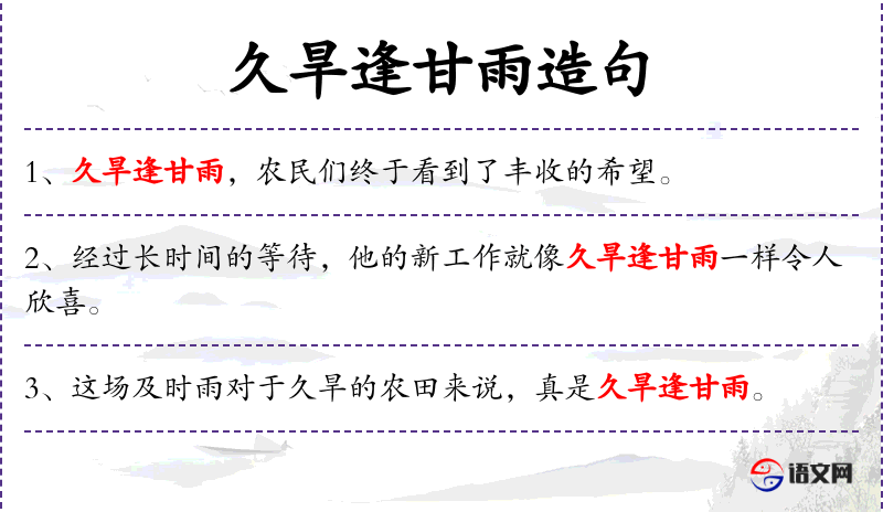 - 久旱逢甘雨:成语,比喻长期缺乏的东西突然得到补充。