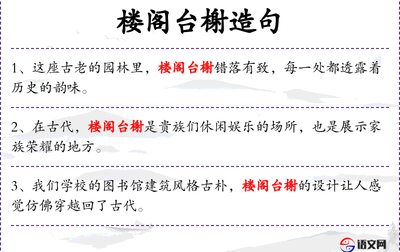 5. 【楼阁台榭】 楼:高楼;阁:架空的楼;台:土筑的高坛;榭:台上的房屋。泛指高大华丽的建筑群。