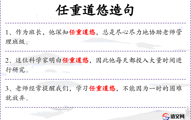 - 成语:任重道悠,源自《左传·宣公十五年》,强调责任重大和道路漫长。