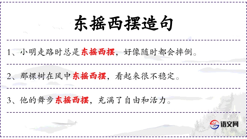 - “东摇西摆”是一个汉语成语,常用于形容物体在风中摇摆的样子。