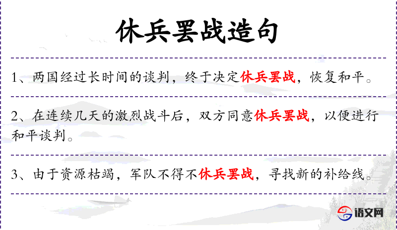 - 休兵罢战:停止军事行动,通常指暂时停止战斗。