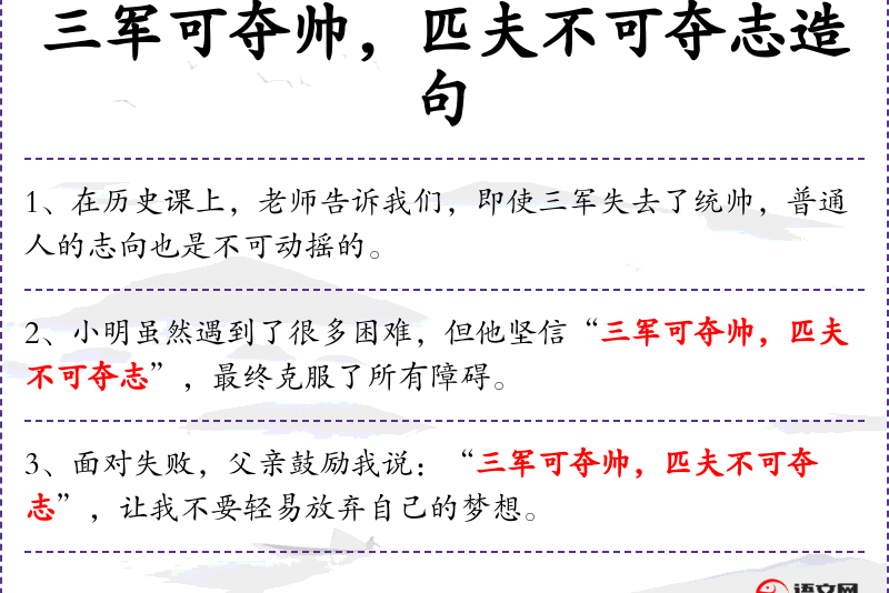 - 成语典故:这句成语出自《论语·子罕》,原文为“子曰:‘三军可夺帅也,匹夫不可夺志也。’”