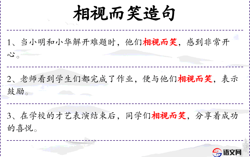 3. 【相视而笑】 - 双方互相看着,发出会心的微笑。形容二者情合意洽的情态。