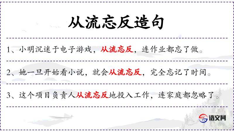 - 从流忘反:成语,形容沉迷于某事而忘记其他一切。