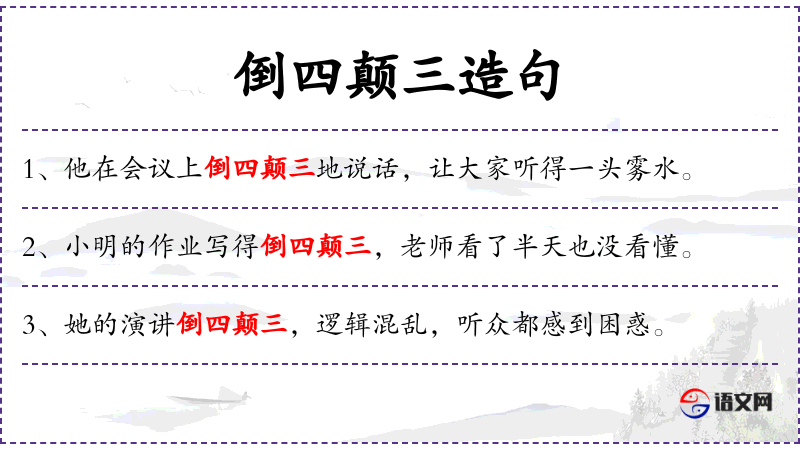 - 倒四颠三:这个成语反映了中文中对事物有序性的重视,以及对混乱状态的负面评价。