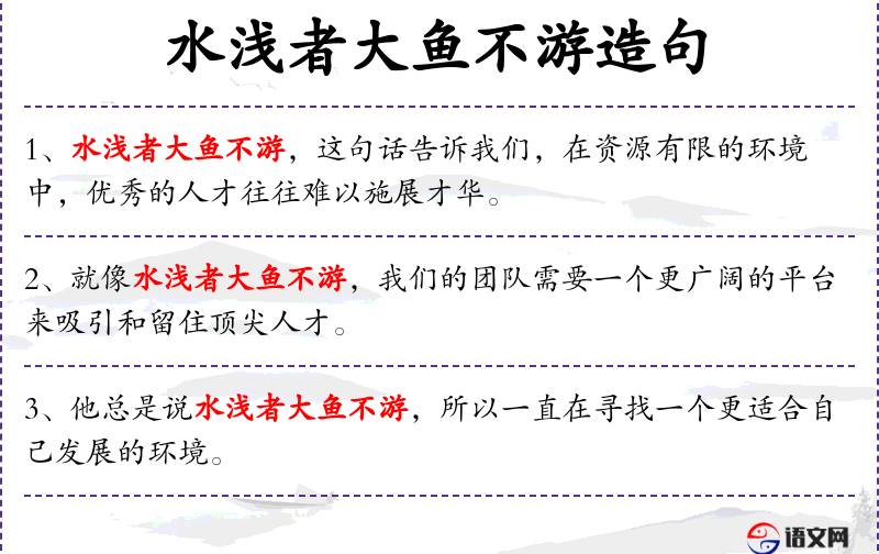 5. 【水浅者大鱼不游】 水太浅则大鱼不能生存。比喻条件太差或待人过苛,有才德的人则难以发挥其特长。
