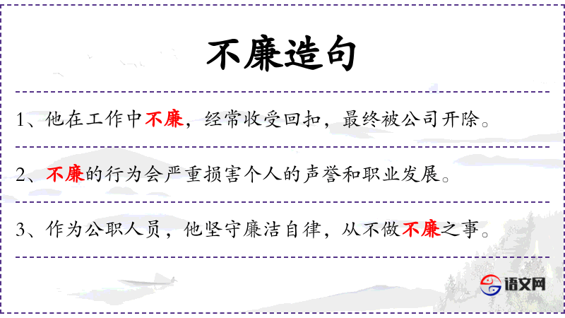 1. 【不廉】 不断裂; 不考察; 不廉洁,贪得。