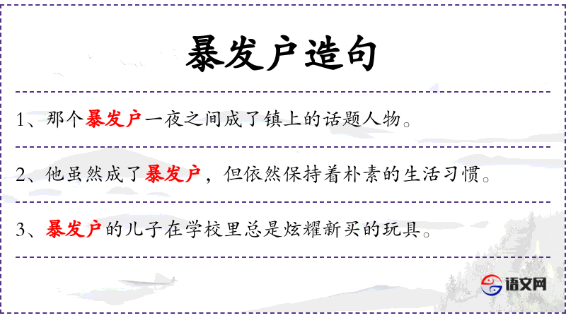 4. 【暴发户】 - 指突然发了财得了势的人。