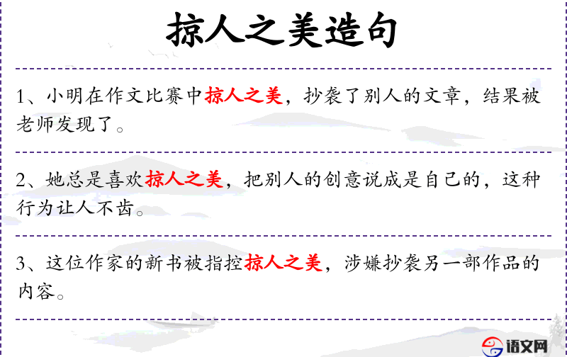 - 掠人之美:指未经允许使用他人的优点或成就来提升自己。
