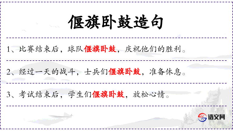- 偃旗卧鼓:成语,意指停止战斗,不再进行军事行动。