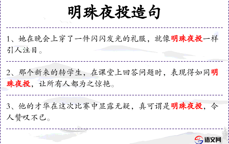 - 明珠夜投:成语,比喻珍贵的东西在夜晚显得更加耀眼。
