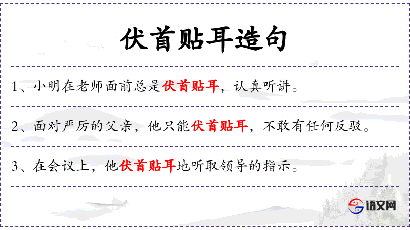 句子:“面对严厉的父亲,他只能伏首贴耳,不敢有任何反驳。”