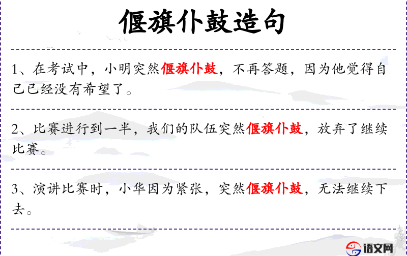 - 偃旗仆鼓:这个成语来源于古代战争,表示停止战斗。在现代汉语中,常用来比喻停止某种活动或斗争。