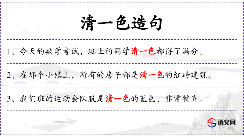 1. 【清一色】 - 原指打麻将时由一种花色组成的一副牌。后比喻全部由同一种成分构成。