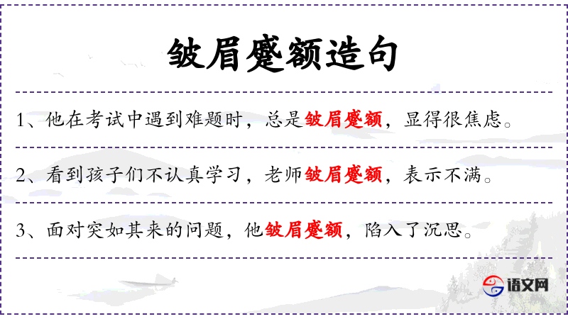 1. 【皱眉蹙额】 - 蹙:收缩。布满皱纹的样子。
